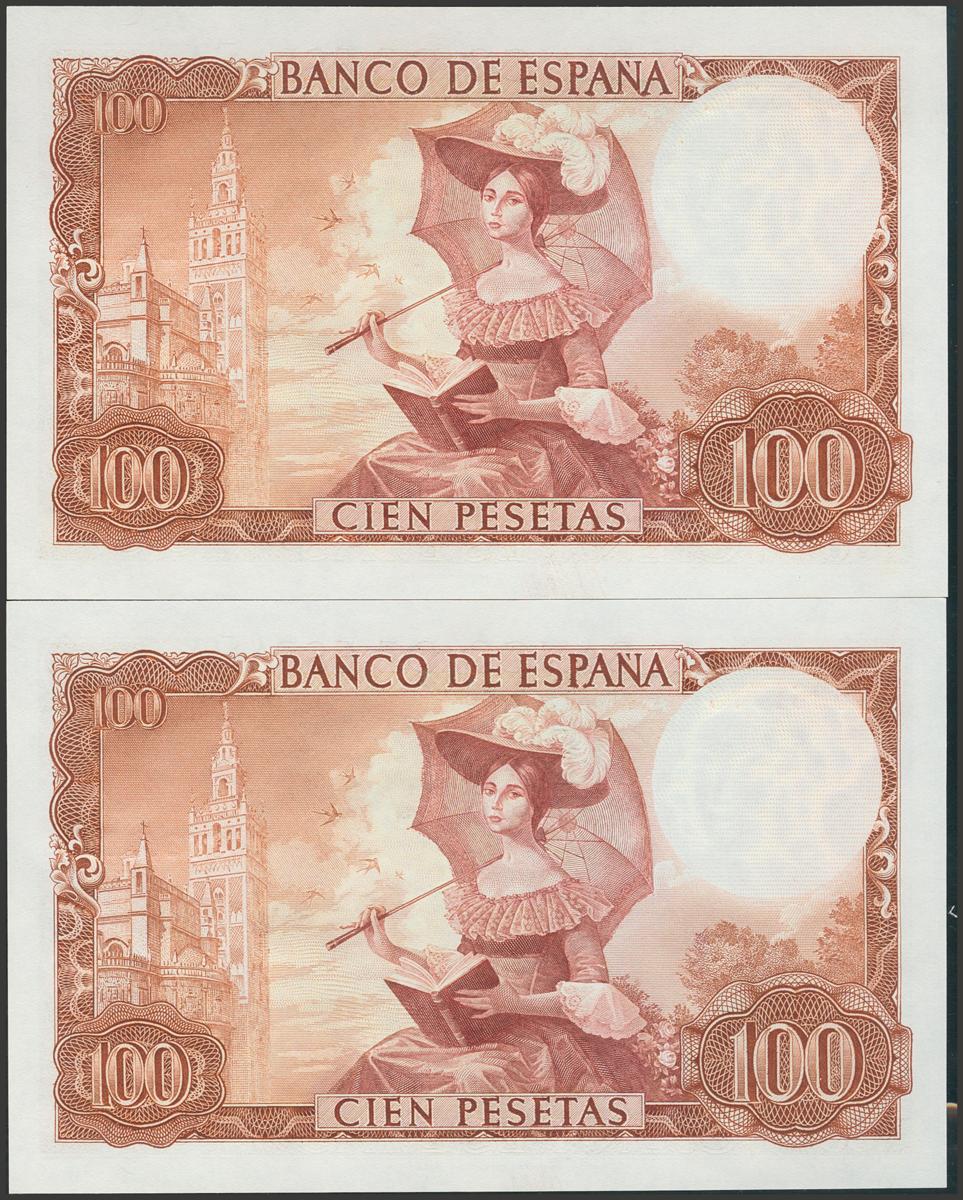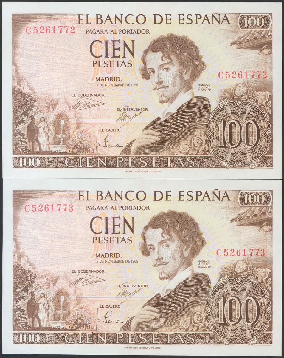 100 Pesetas. 19 de Noviembre de 1965. Pareja correlativa. Serie C. (Edifil 2017: 470a). Apresto original. SC.