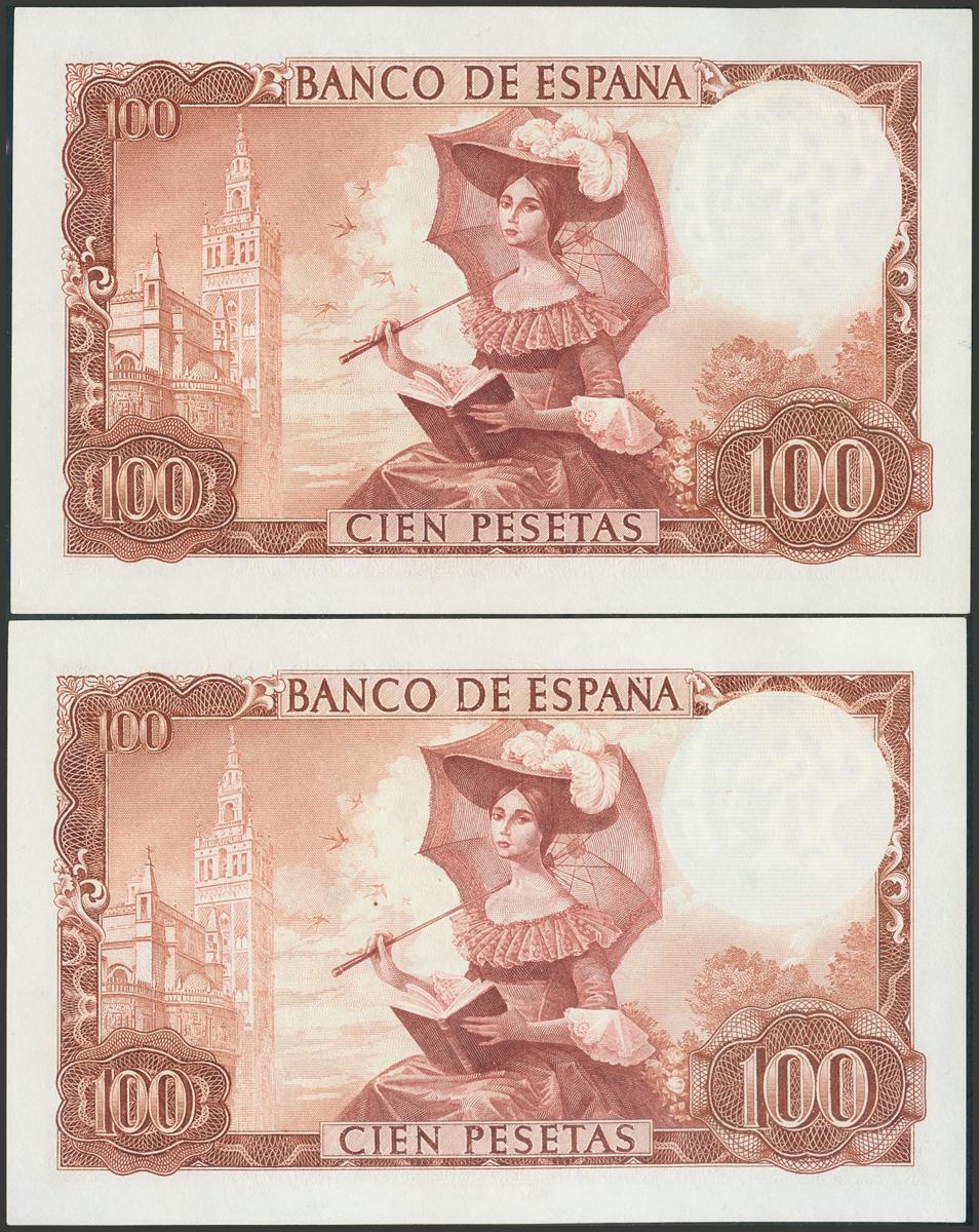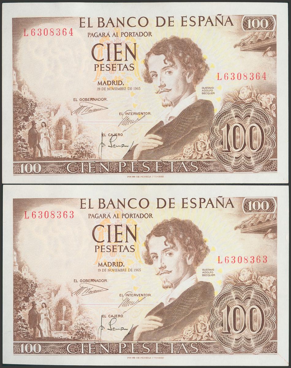 100 Pesetas. 19 de Noviembre de 1965. Pareja correlativa. Serie L. (Edifil 2017: 470a). Conserva parte del apresto original. SC.