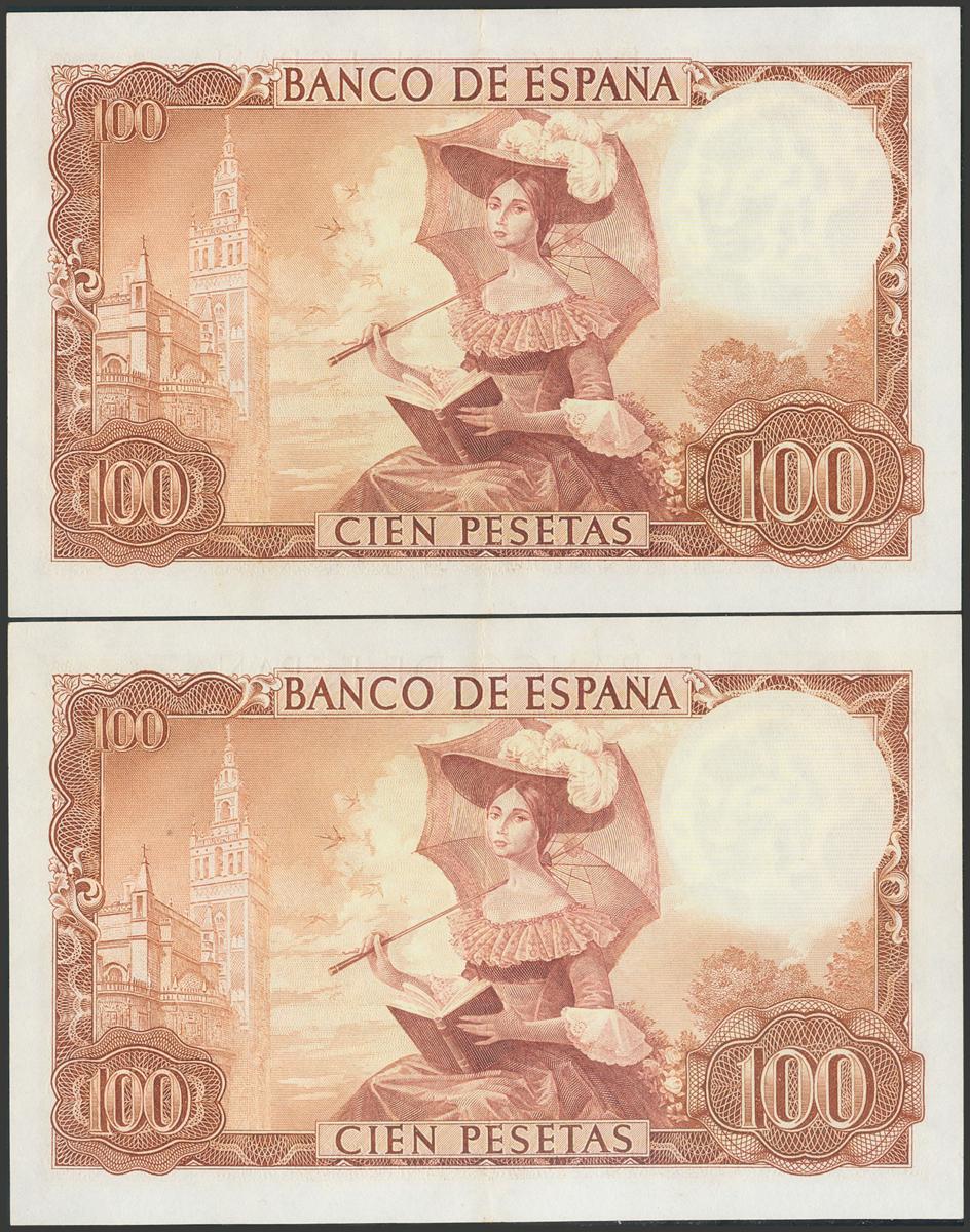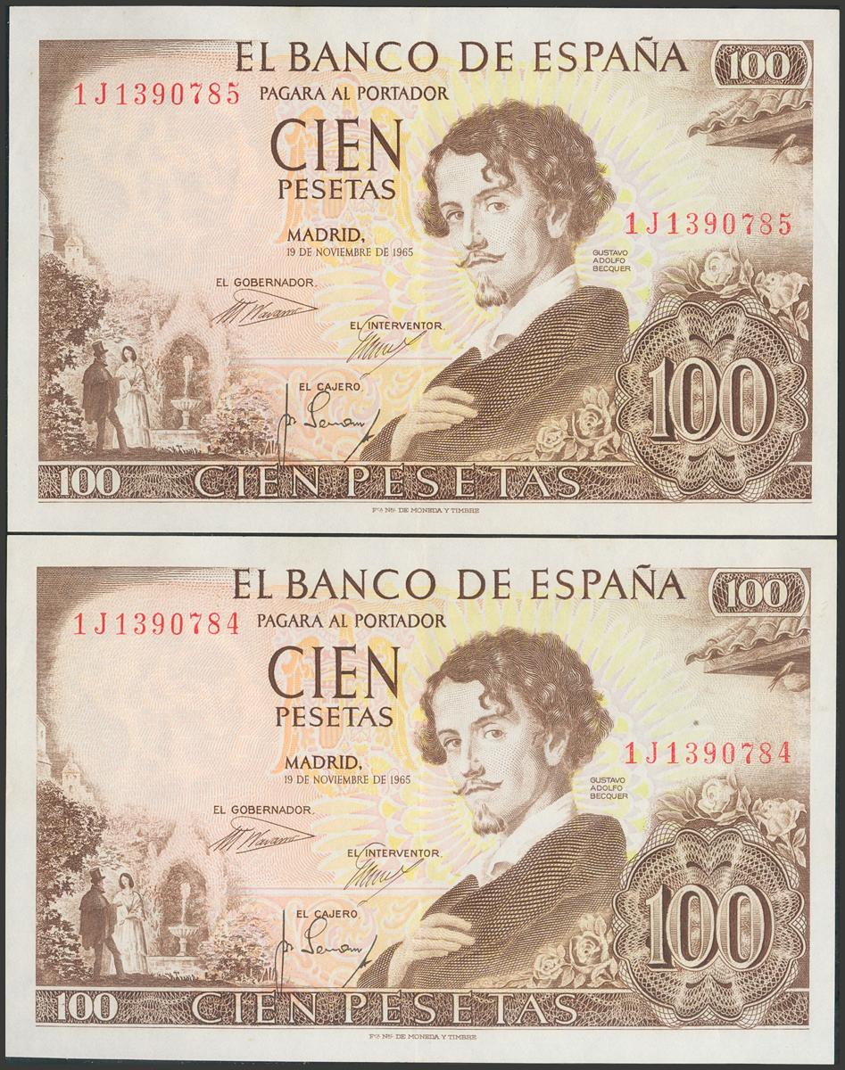100 Pesetas. 19 de Noviembre de 1965. Pareja correlativa. Serie 1J. (Edifil 2017: 470a). Conserva parte del apresto original. EBC.