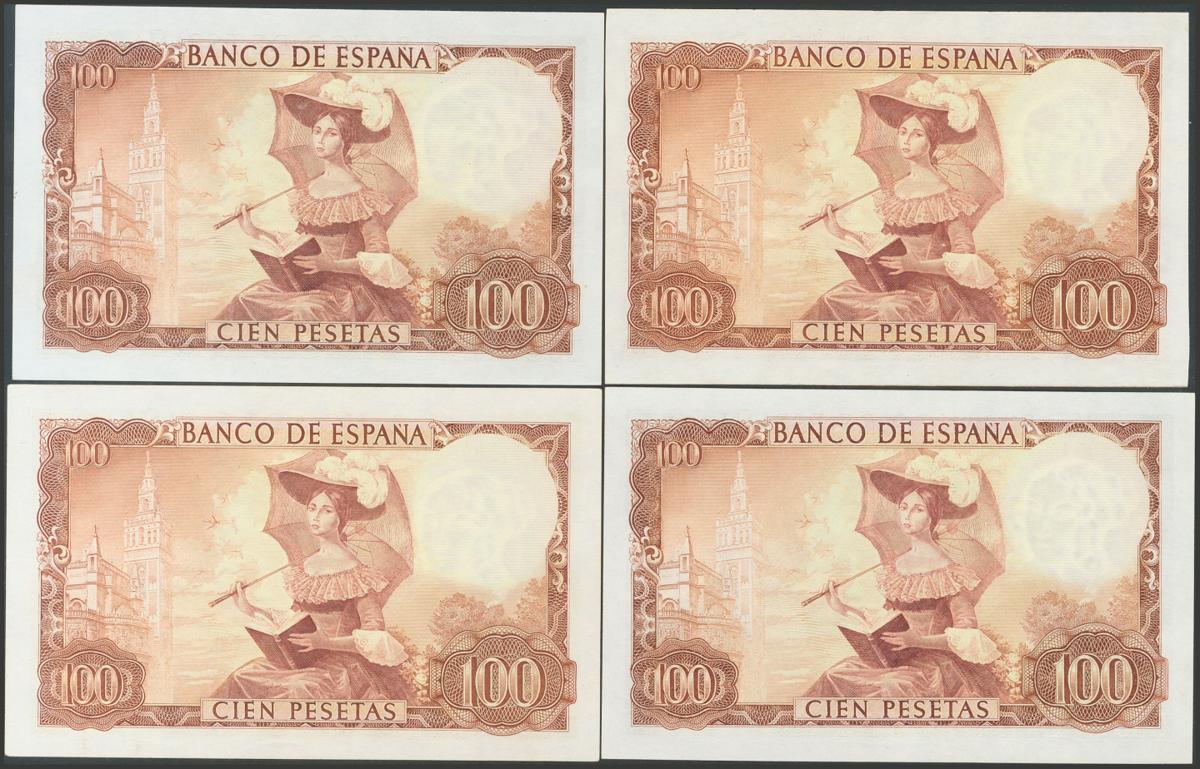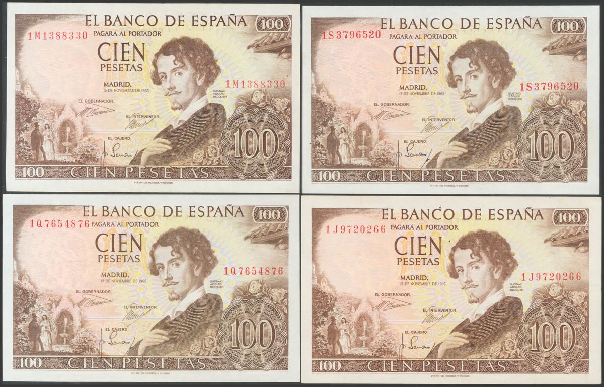 Conjunto de 4 billetes de 100 Pesetas, emitidos el 19 de Noviembre de 1965, con las series 1S, 1J, 1M y 1Q (Edifil 2017: 470a), conservan todo el apresto original. SC/SC-.