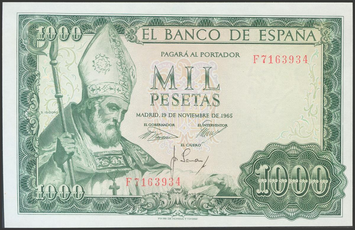 1000 Pesetas. 19 de Noviembre de 1965. Serie F. (Edifil 2017: 471b). Apresto original. EBC+.