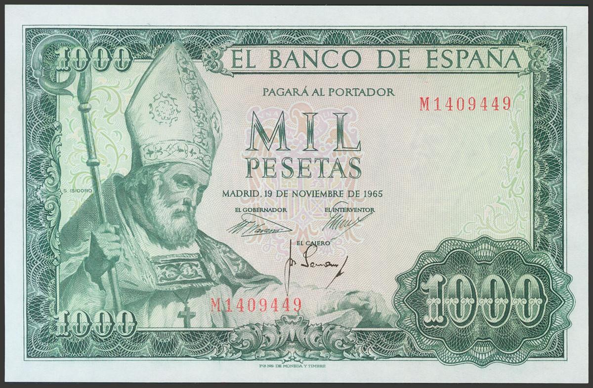 1000 Pesetas. 19 de Noviembre de 1965. Serie M. (Edifil 2017: 471b). Apresto original. SC.