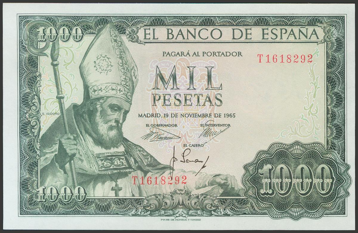 1000 Pesetas. 19 de Noviembre de 1965. Serie T. (Edifil 2017: 471b). Apresto original. SC.