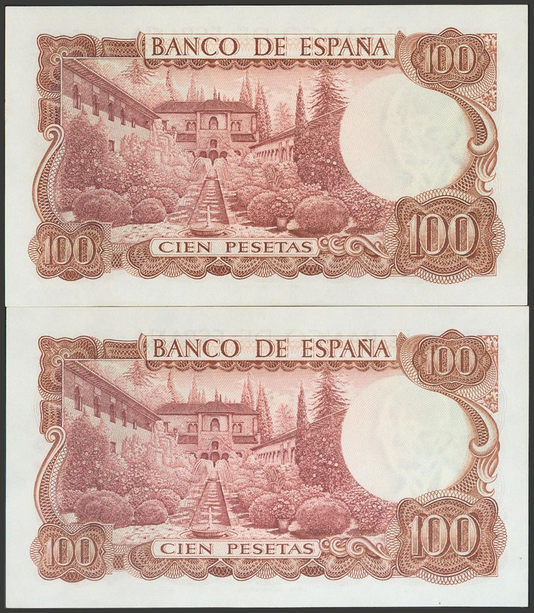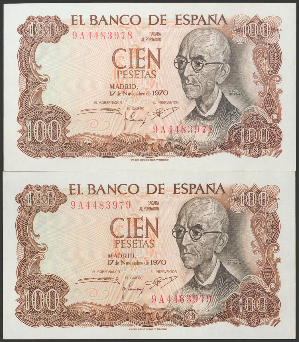 100 Pesetas. 17 de Noviembre de 1970. Pareja correlativa. Serie especial 9A. (Edifil 2017: 472d). SC/SC-.
