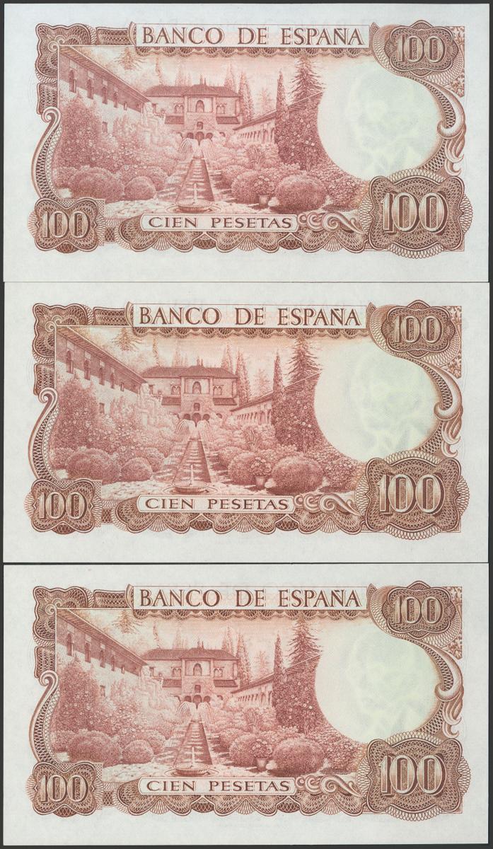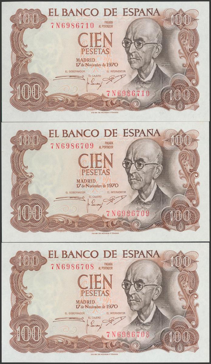 100 Pesetas. 17 de Noviembre de 1970. Trío correlativo. Serie 7N. (Edifil 2017: 472c). SC.