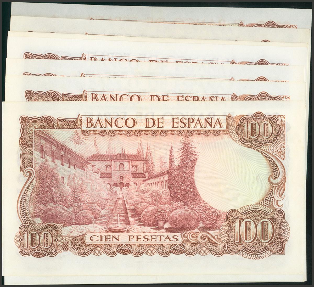 Conjunto de 12 billetes de 100 Pesetas, emitidos el 17 de Noviembre de 1970, con diferentes series 1N, 2S, 5A, 5I, 5V, 5Z, 6Q, 6S, 6V, 7C, 7D y 7F (Edifil 2017: 472c), con su apresto original. SC/SC-.