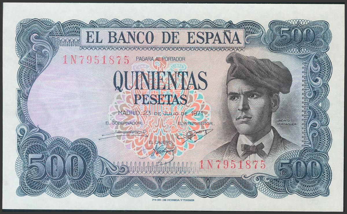 500 Pesetas. 23 de Julio de 1971. Serie 1N. (Edifil 2017: 473a). Apresto original. SC-.