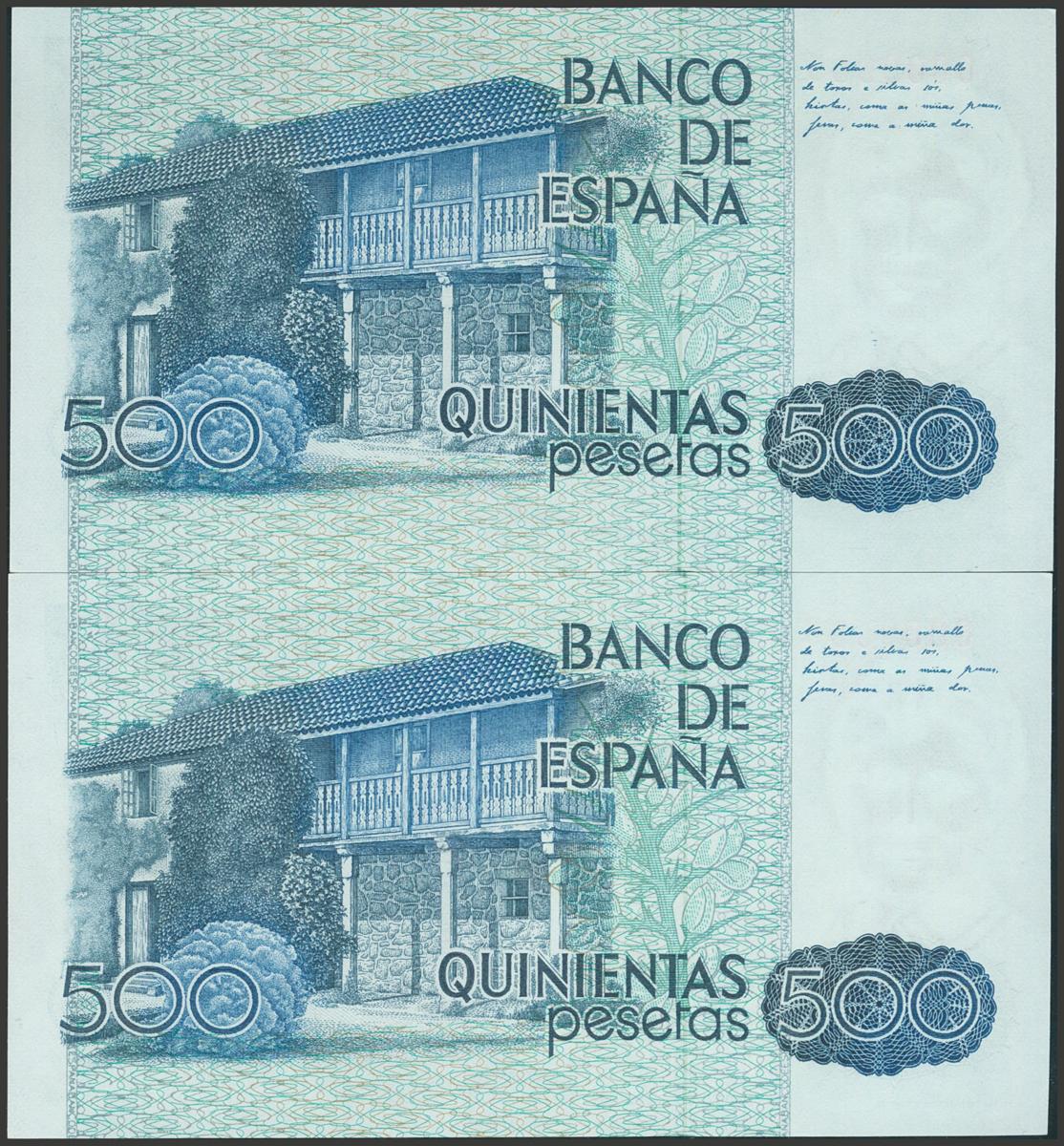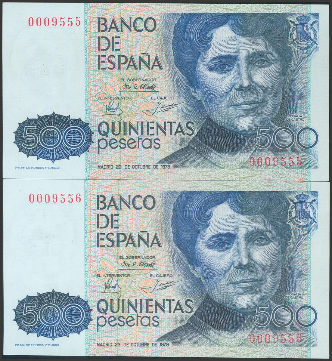 500 Pesetas. 23 de Octubre de 1979. Pareja correlativa. Sin serie y bajísima numeración. (Edifil 2017: 476). SC.