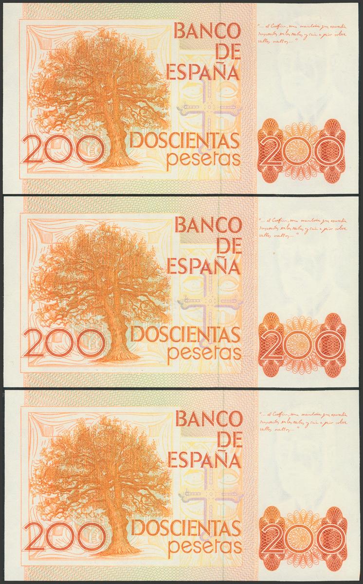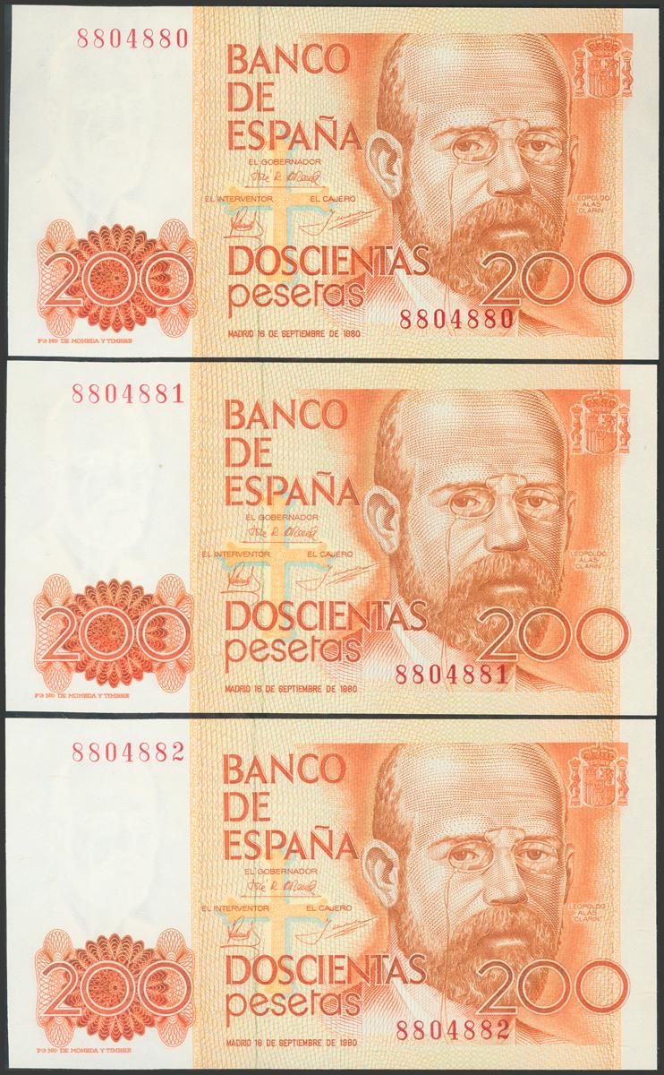 200 Pesetas. 18 de Septiembre de 1980. Trío correlativo. Sin serie. (Edifil 2017: 480). SC.