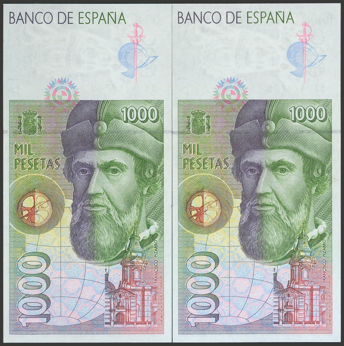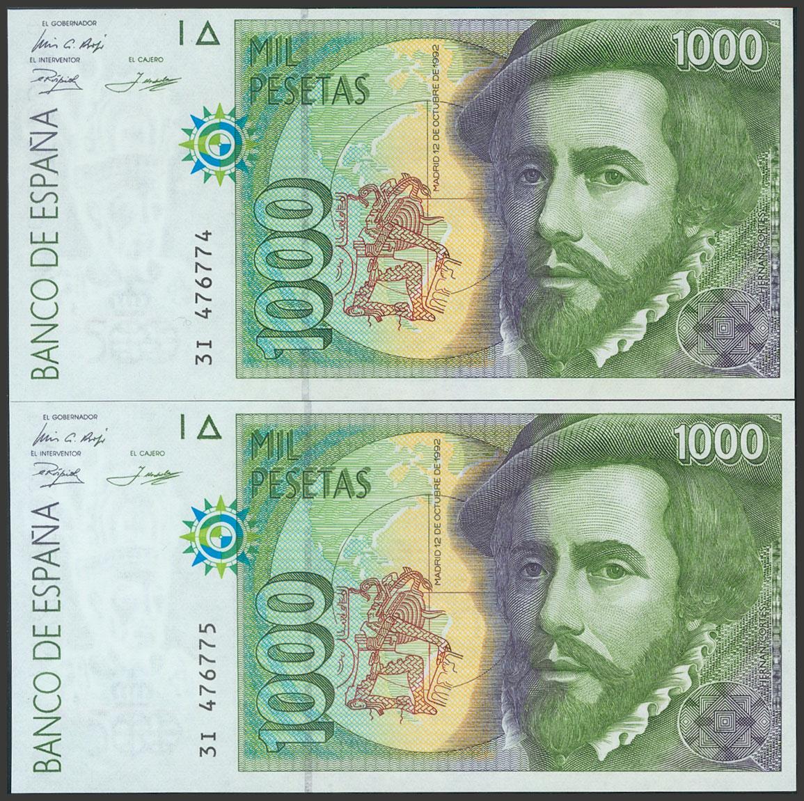 1000 Pesetas. 12 de Octubre de 1992. Pareja correlativa. Serie 3I. Tipo II (párpado oscuro). (Edifil 2017: 483b). Apresto original. SC.