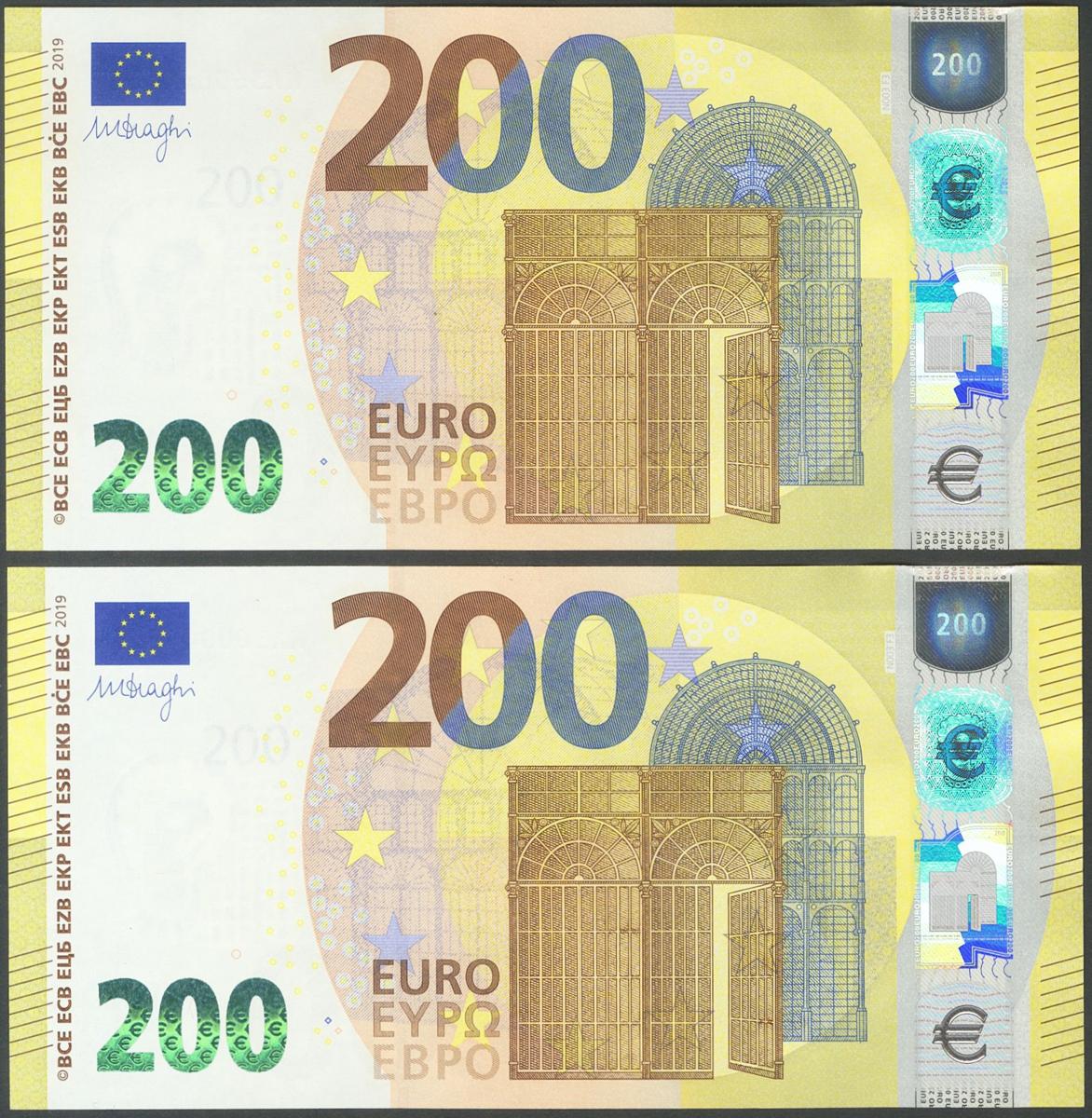 200 Euros. 2019. Firma Draghi. Serie N (Austria). Pareja correlativa (cabe recordar que el último dígito de todos los billetes denominados en euros es para control interno del Banco Central Europeo, el que marca la correlatividad de los billetes es el penúltimo dígito). No catalogado en Edifil. SC.