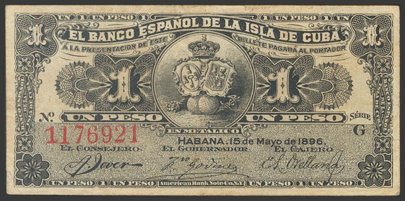 BANCO ESPAÑOL DE LA ISLA DE CUBA. 1 Peso. 15 de Mayo de 1896. Serie G. (Edifil 2017: 71). MBC.