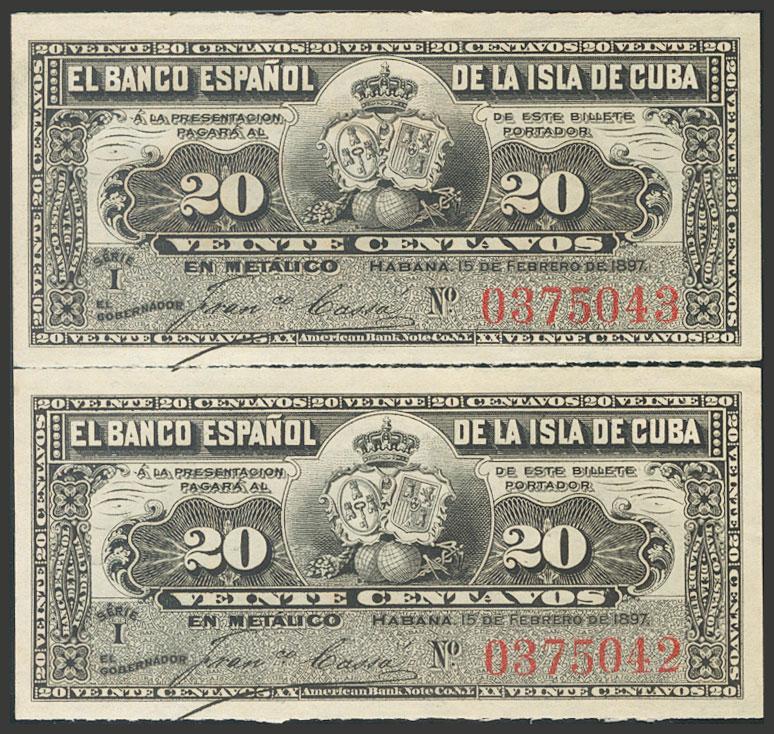 BANCO ESPAÑOL DE LA ISLA DE CUBA. 20 Centavos. 15 de Febrero de 1897. Pareja correlativa. Serie I. (Edifil 2017: 85). SC-.
