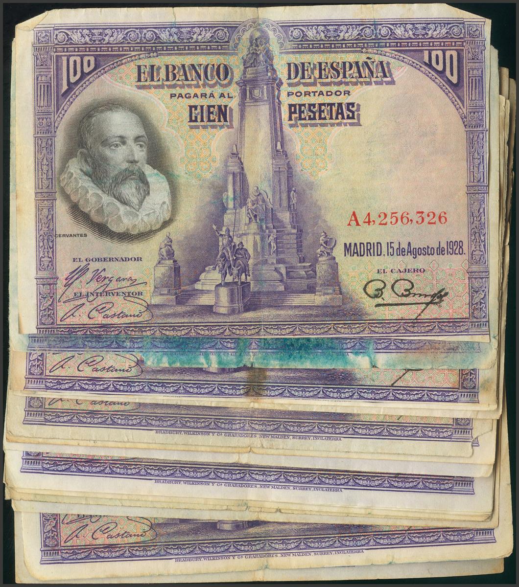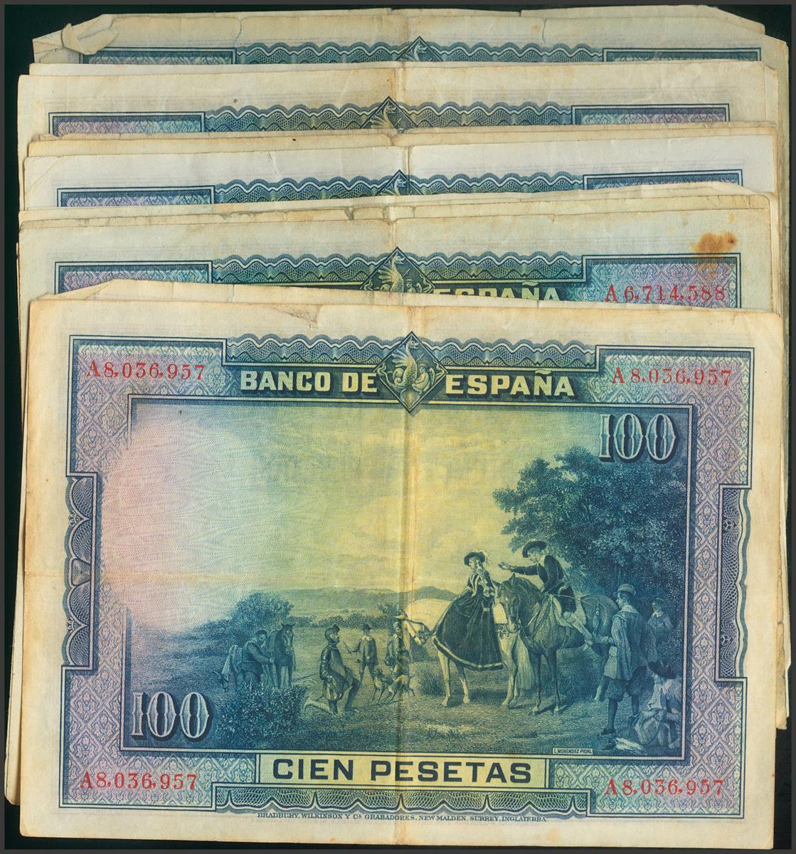 Conjunto de 19 billetes de 100 Pesetas emitidos el 15 de Agosto de 1928, sin serie y con la serie A, conservaciones bajas o muy bajas. A EXAMINAR.El importe de la liquidación de este lote irá destinado a Manos Unidas.
