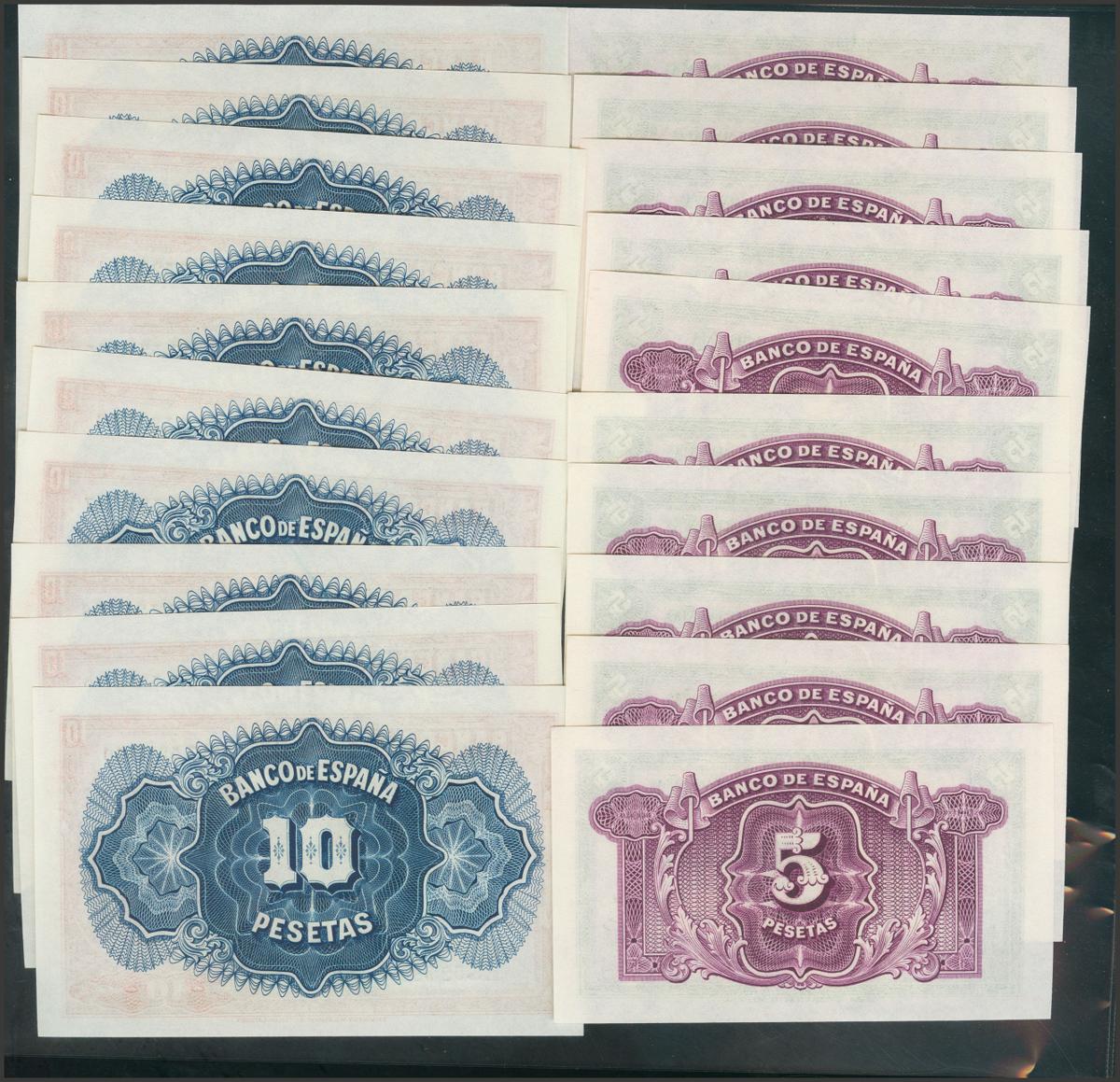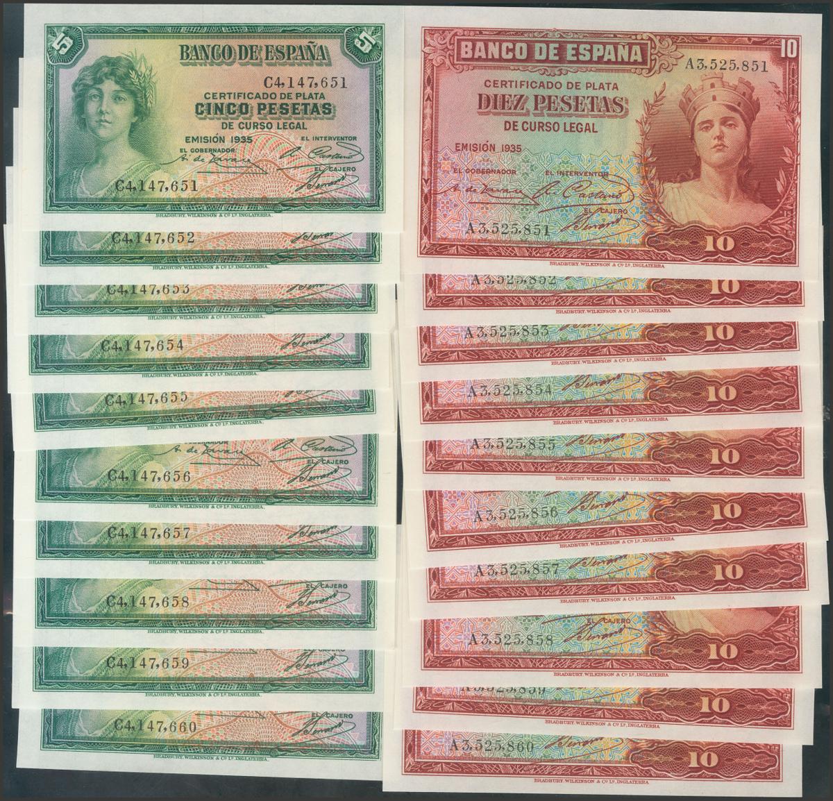 Conjunto de 10 series completas de los billetes correlativos de 5 Pesetas y 10 Pesetas emitidos en 1935, con las series C y A, respectivamente. (Edifil 2017: 363/64a). SC.
