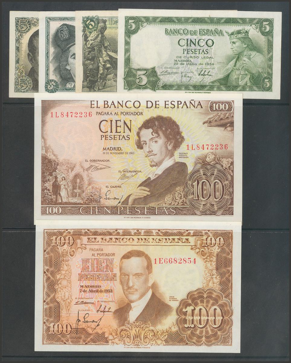 Conjunto de 6 billetes del Banco de España de diversas emisiones y en diversas calidades. A EXAMINAR.