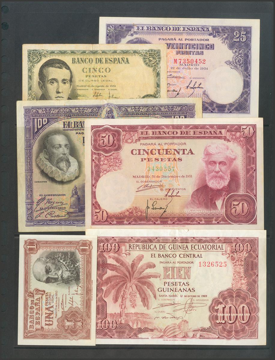 Conjunto de 6 billetes del Banco de España, incluyendo uno de Guinea Ecuatorial de 1969, diferentes estados de conservación. A EXAMINAR.