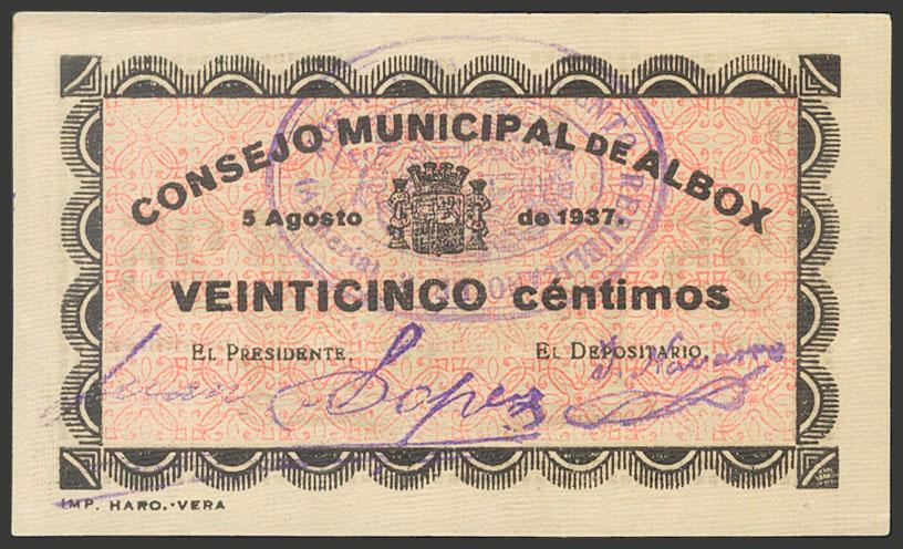 ALBOX (ALMERIA). 25 Céntimos. 5 de Agosto de 1937. (González: 238). SC.