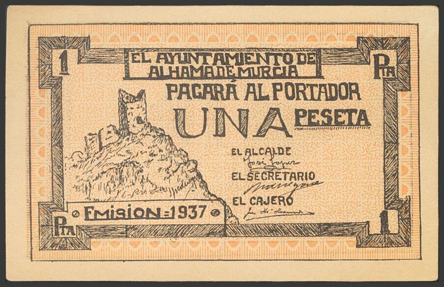 ALHAMA DE MURCIA (MURCIA). 1 Peseta. 1937. Serie E. (González: 496). Inusual. SC-.