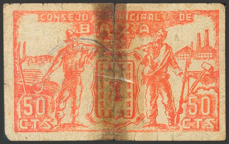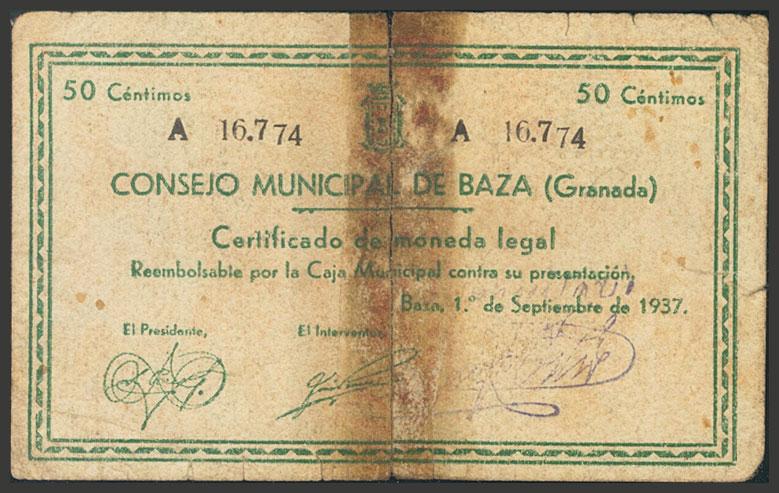 BAZA (GRANADA). 50 Céntimos. 1 de Septiembre de 1937. Serie A. (González: 906). Presencia de cinta adhesiva uniendo el billete. RC-.
