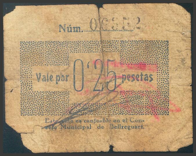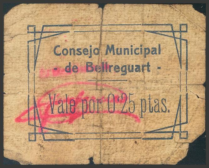BELLREGUART (VALENCIA). 25 Céntimos. (1937ca). (González: 955). Raro. RC.
