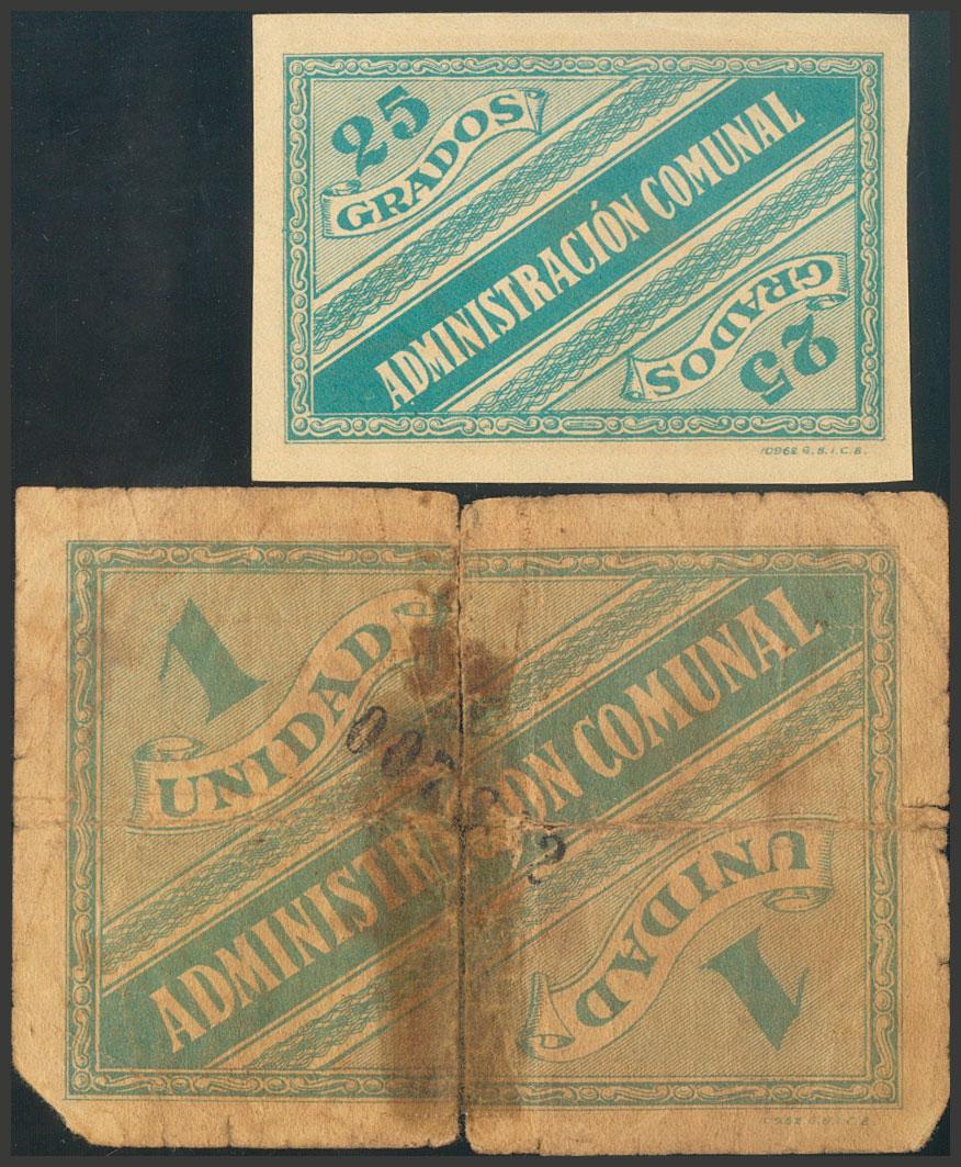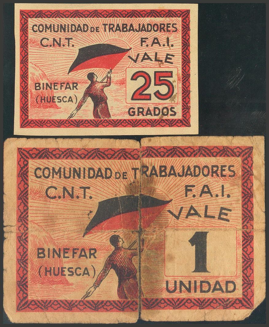 BINEFAR (HUESCA). 25 Grados y 1 Unidad. (1937ca). (González: 1217, 1219). Raros, el 1 Unidad unido con cinta adhesiva. EBC+/RC-.