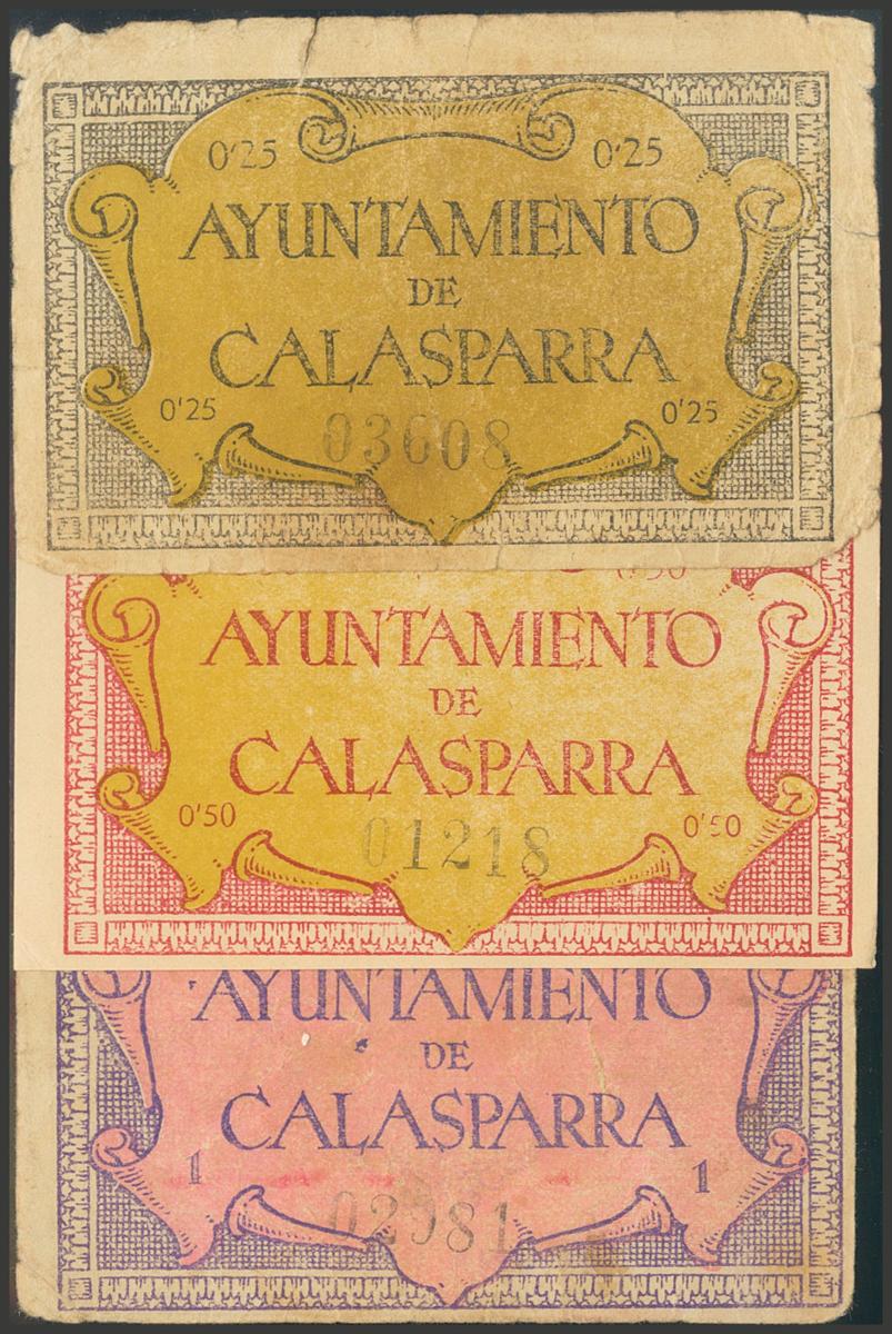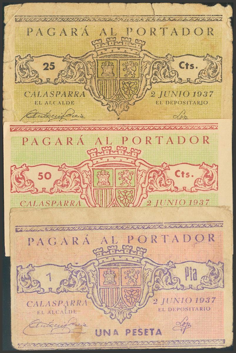 CALASPARRA (MURCIA). 25 Céntimos, 50 Céntimos y 1 Peseta. 2 de Junio de 1937. (González: 1403, 1404, 1405). Raros. MBC-.