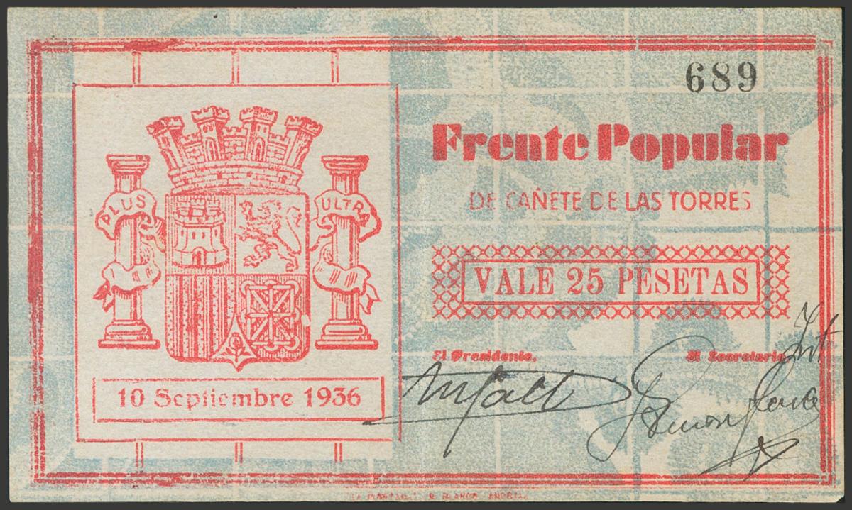 CAÑETE DE LAS TORRES (CORDOBA). 25 Pesetas. 10 de Septiembre de 1936. (González: 1597). Muy raro. EBC.