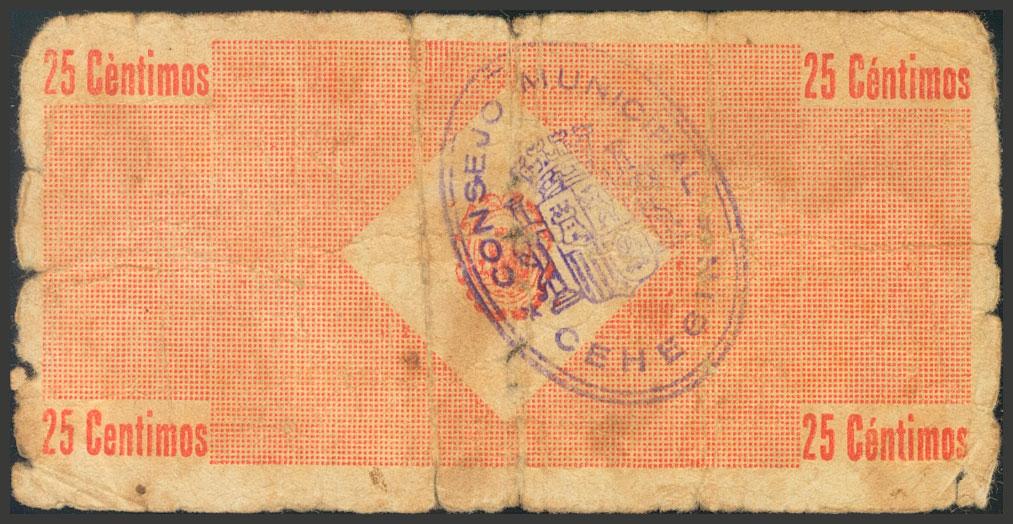 CEHEGIN (MURCIA). 25 Céntimos. 17 de Febrero de 1937. Serie A. (González: 1876). Inusual. RC.