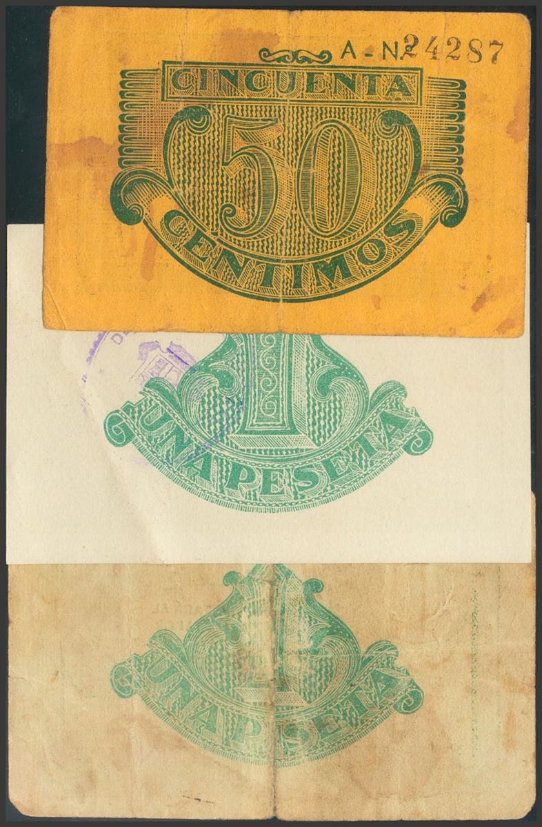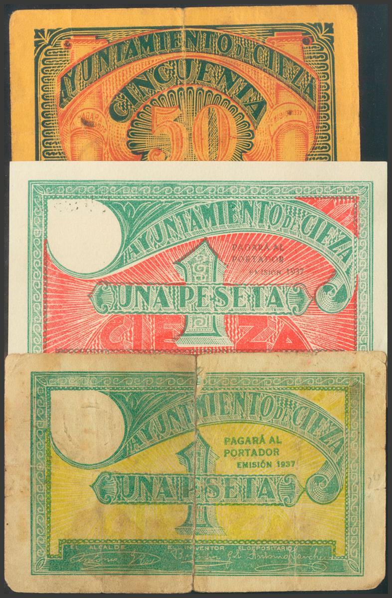 CIEZA (MURCIA). 50 Céntimos y 1 Peseta (2). 1937. Serie A, sin serie y serie B, respectivamente. (González: 1960, 1961, 1962). Inusuales. MBC+/BC+.