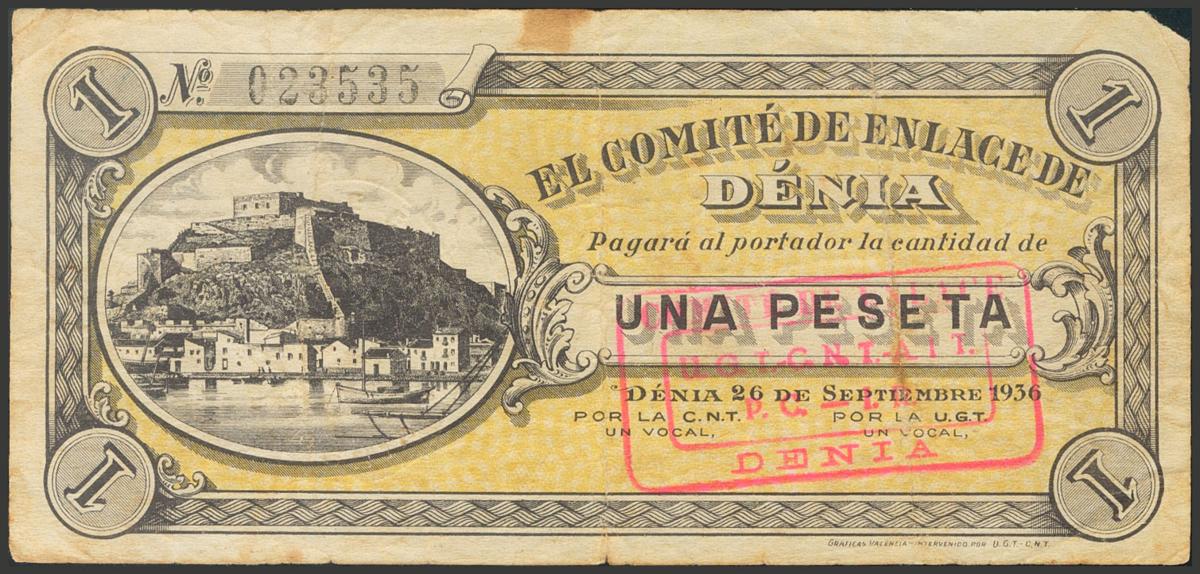 DENIA (ALICANTE). 1 Peseta. 26 de Septiembre de 1936. (González: 2212). BC-.