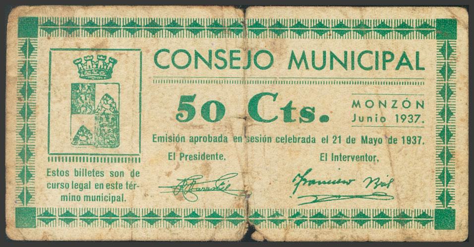 MONZON (HUESCA). 50 Céntimos. Junio 1937. (González: 3675). Inusual. BC.