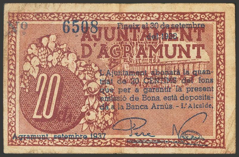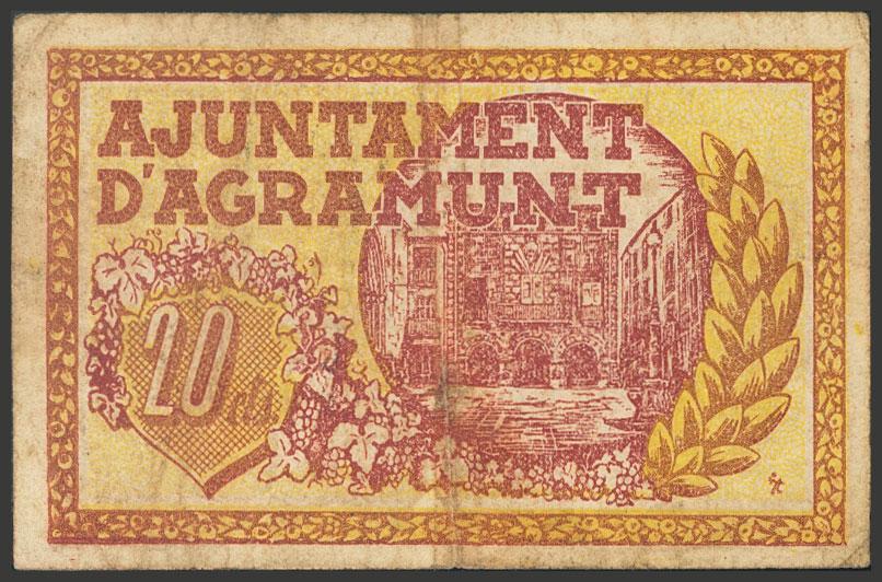 AGRAMUNT (LERIDA). 20 Céntimos. Septiembre 1937. (González: 6015). Inusual. MBC+.