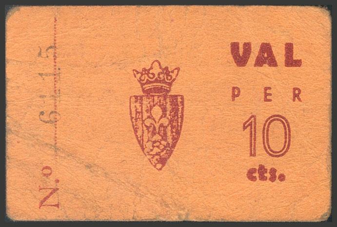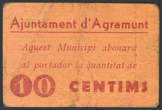 AGRAMUNT (LERIDA). 10 Céntimos. (1937ca). Escudo pequeño. (González: 6017). Raro. MBC.