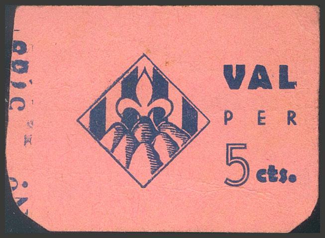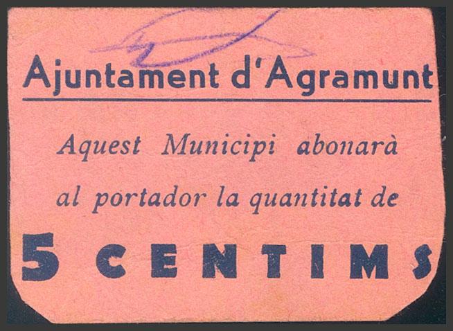 AGRAMUNT (LERIDA). 5 Céntimos. (1937ca). Escudo grande. (González: 6018). Inusual. EBC.