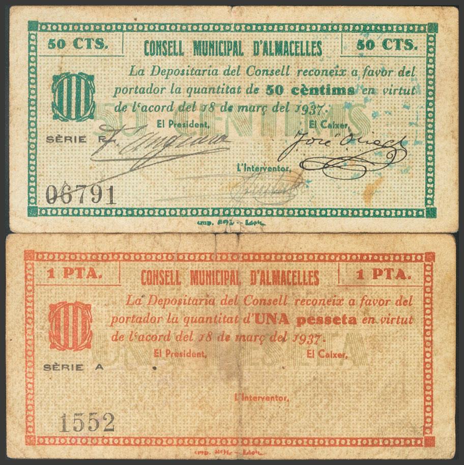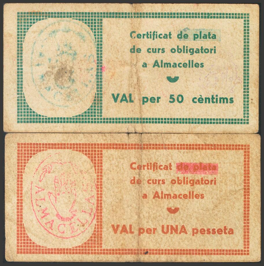 ALMACELLES (LERIDA). 50 Céntimos y 1 Peseta. 18 de Marzo de 1937. Series F y A, respectivamente. (González: 6205/06). Rara serie completa. MBC.