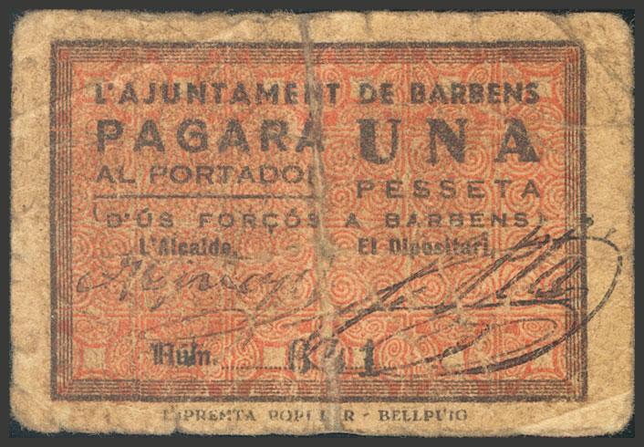 BARBENS (LERIDA). 1 Peseta. (1937ca). (González: 6512). Raro. RC.