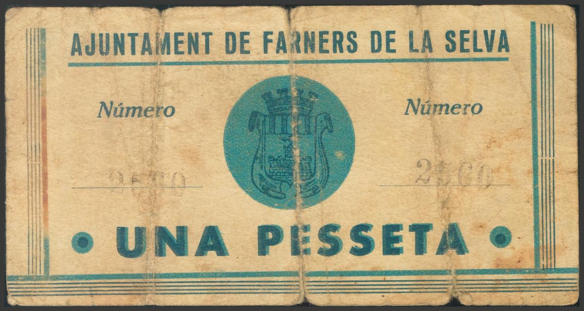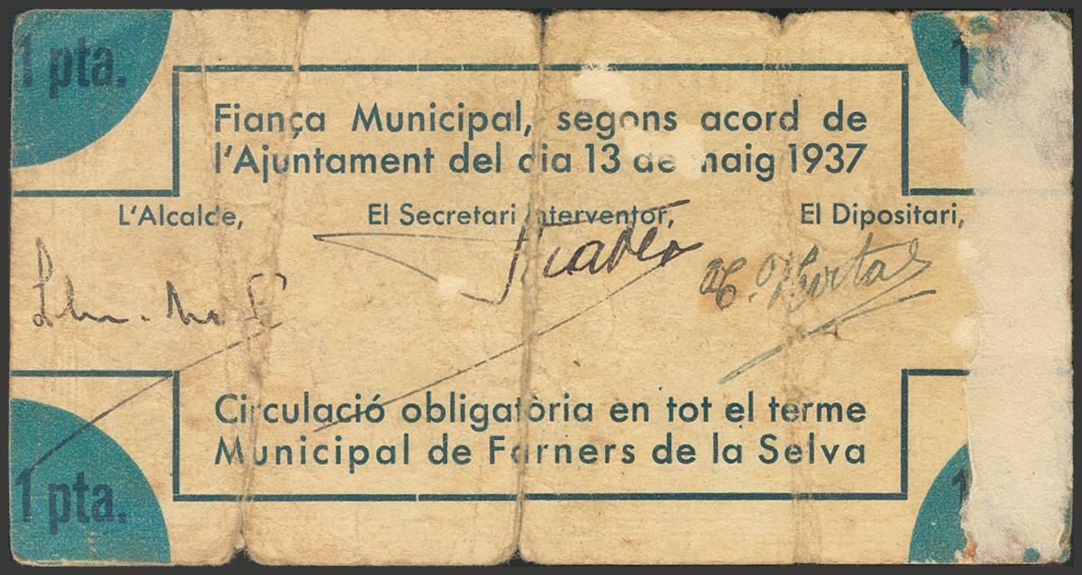 FARNERS DE LA SELVA (GERONA). 1 Peseta. 13 de Mayo de 1937. (González: 7828). Inusual. BC.