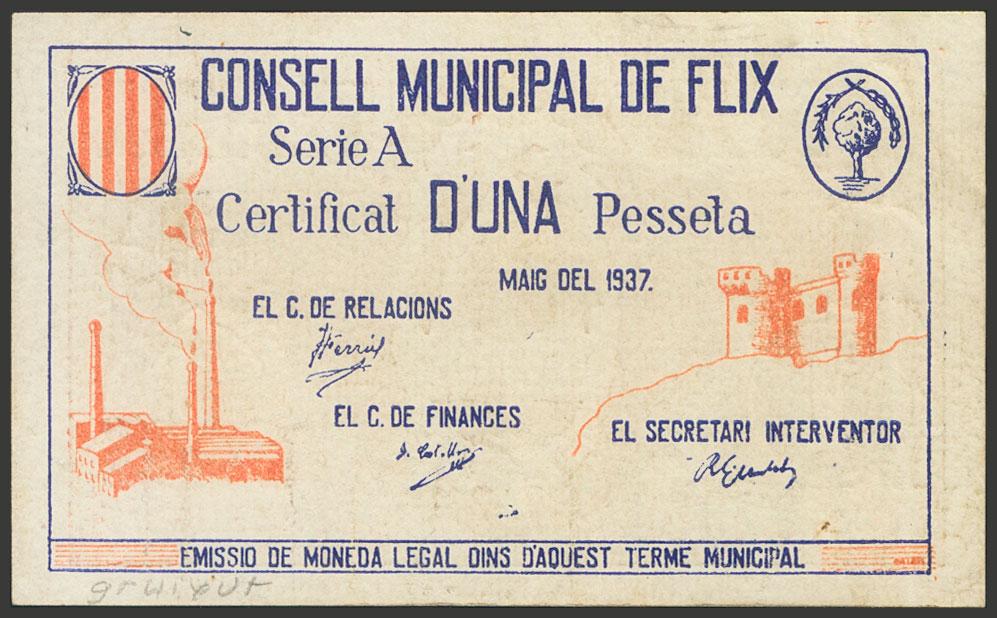 FLIX (TARRAGONA). 1 Peseta. Mayo 1937. Serie A. (González: 7885). Raro. MBC+.