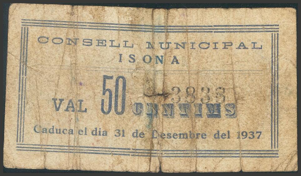 ISONA (LERIDA). 50 Céntimos. (1938ca). (González: 8263). Inusual. BC.