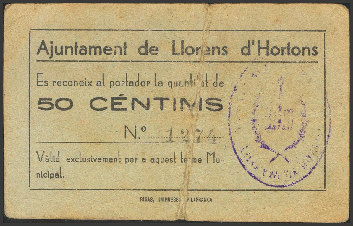 LLORENS DE HORTONS (BARCELONA). 50 Céntimos. (1938ca). (González: 8421). Muy raro. MBC-.