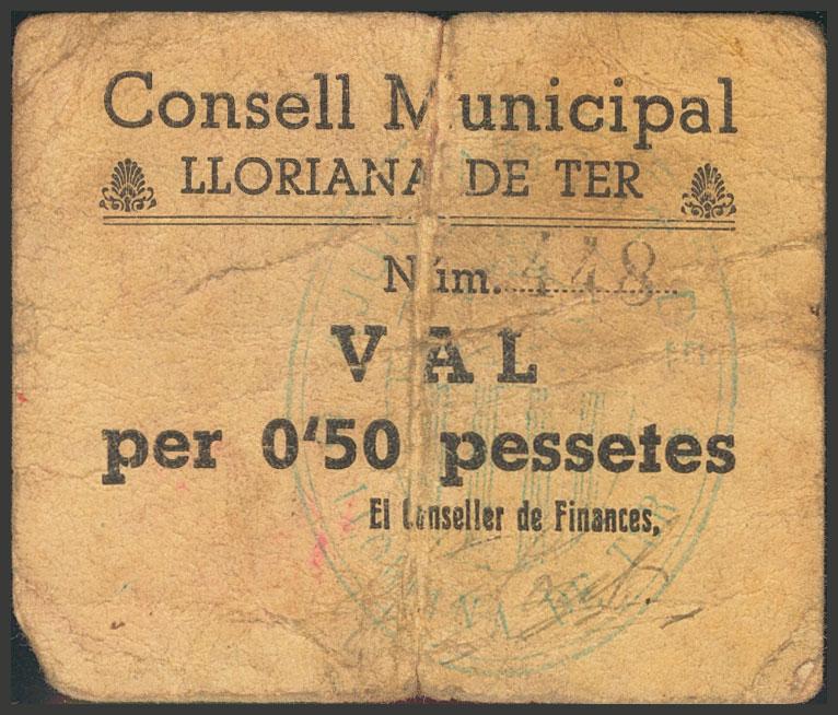 LLORIANA DE TER (BARCELONA). 50 Céntimos. (1938ca). (González: 8443). Muy raro. BC+.