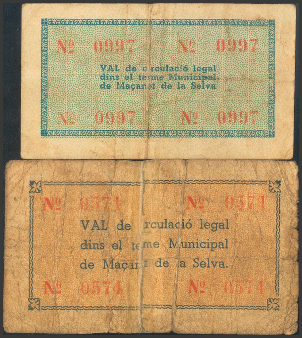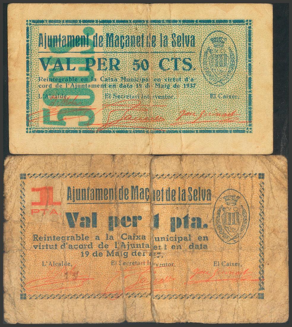 MACANET DE LA SELVA (GERONA). 50 Céntimos y 1 Peseta. 19 de Mayo de 1937. (González: 8449/50). Rara serie completa. MBC-/BC+.