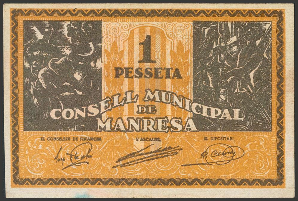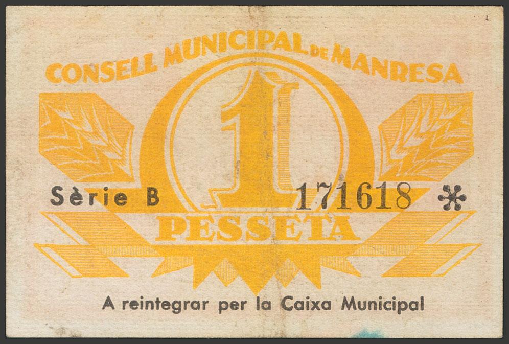 MANRESA (BARCELONA). 1 Peseta. (1937ca). Serie B. (González: 8495). EBC.
