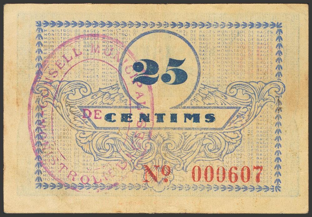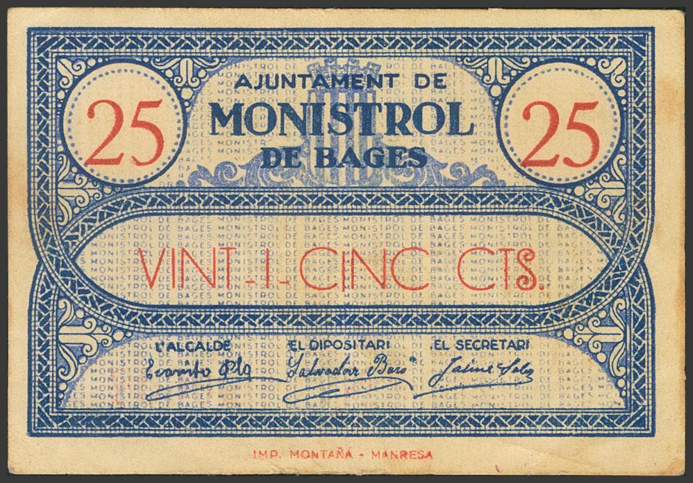 MONISTROL DE BAGES (BARCELONA). 25 Céntimos. (1937ca). (González: 8723). Raro. MBC+.