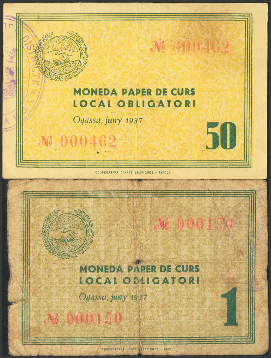OGASSA (GERONA). 50 Céntimos y 1 Peseta. Junio 1937. (González: 8917/18). Rara serie completa. EBC/BC+.