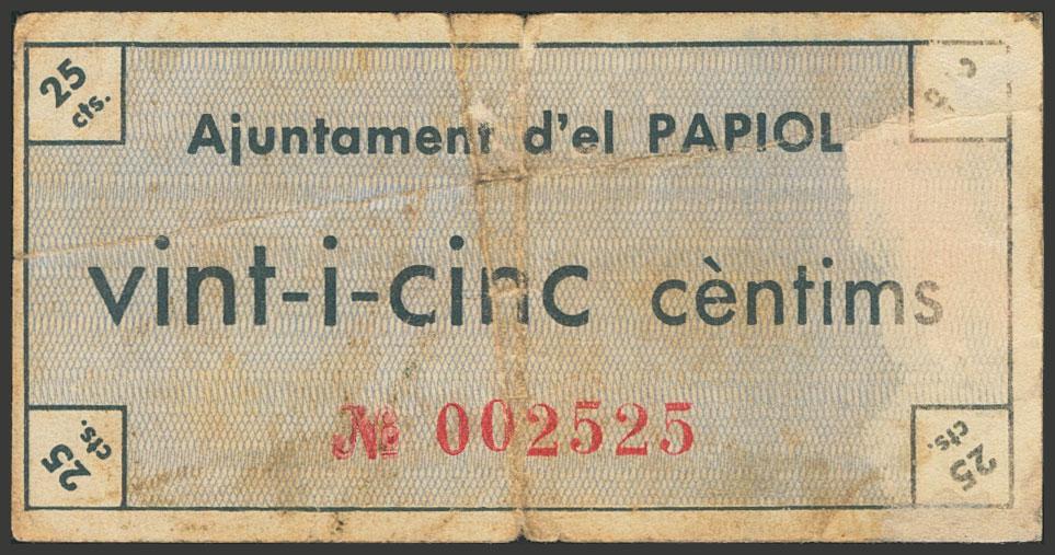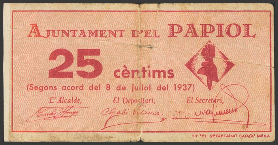 PAPIOL (BARCELONA). 25 Céntimos. 8 de Julio de 1937. (González: 9152). BC+.