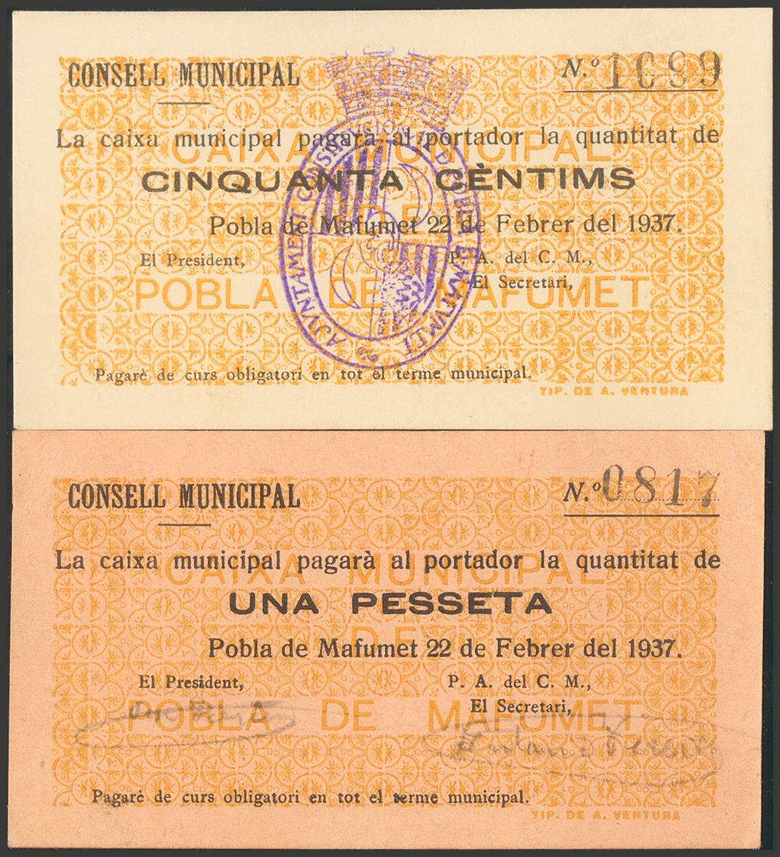 POBLA DE MAFUMET (TARRAGONA). 50 Céntimos y 1 Peseta. 22 de Febrero de 1937. (González: 9322/23). Muy rara serie completa. SC-
