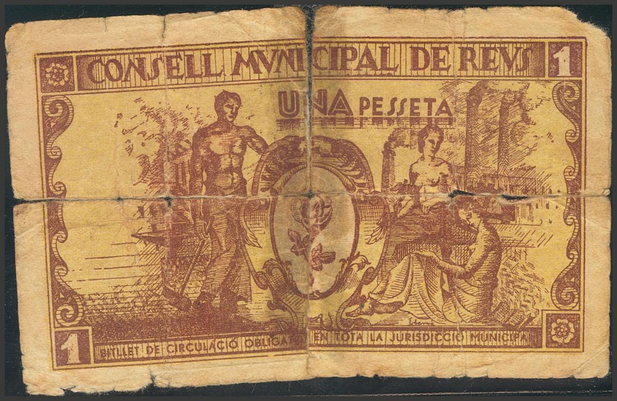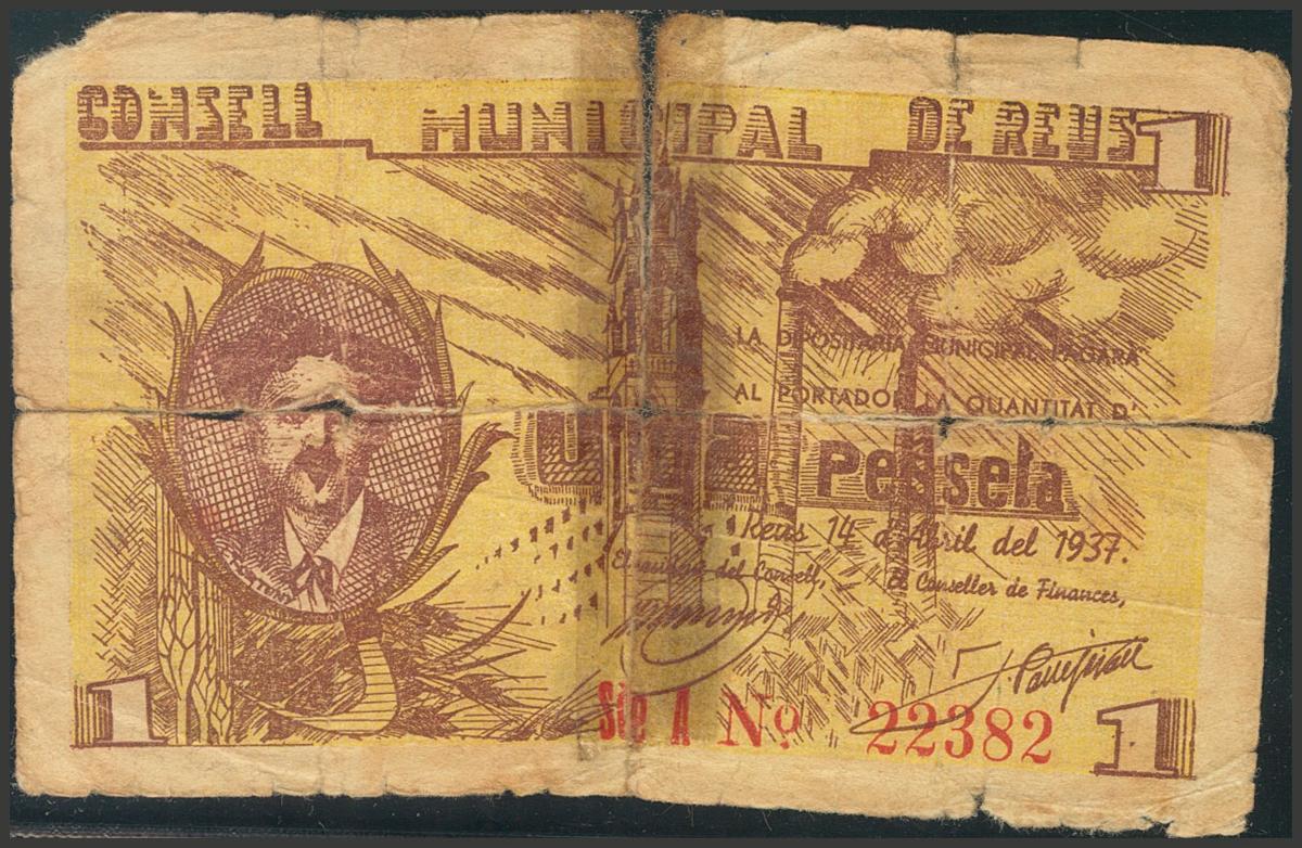 REUS (TARRAGONA). 1 Peseta. 14 de Abril de 1937. Serie A. (González: 9560). Presencia de cinta adhesiva, uniendo cuatro partes del billete. RC-.