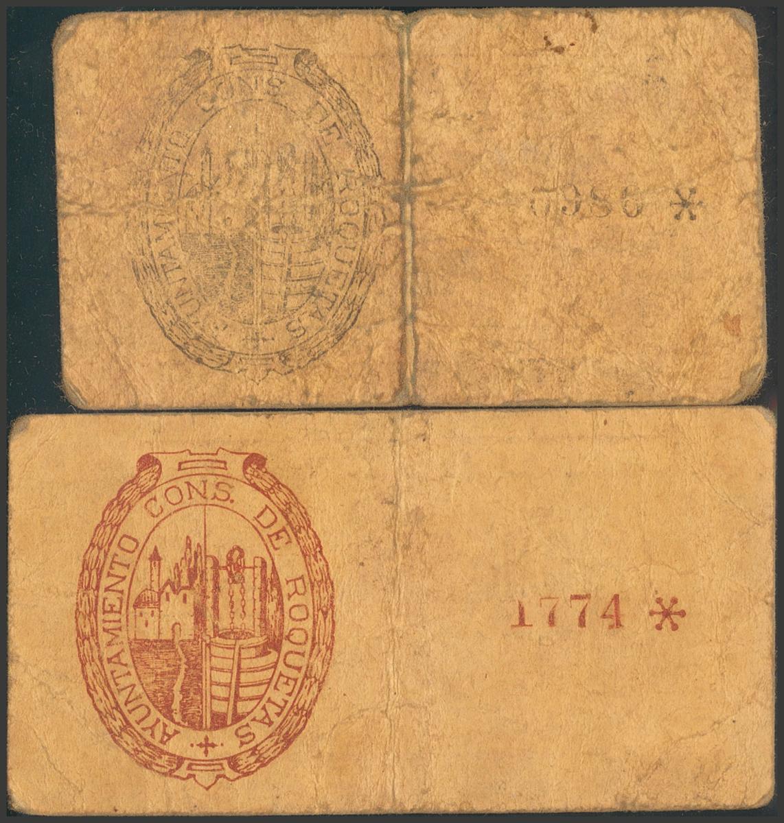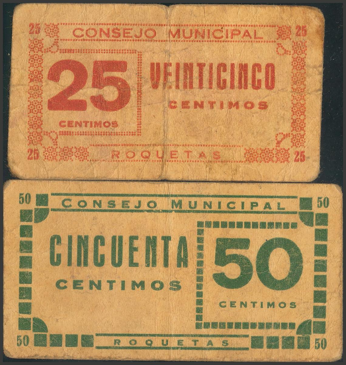 ROQUETAS (TARRAGONA). 25 Céntimos y 50 Céntimos. (1937ca). (González: 9730, 9732). Raros. MBC.